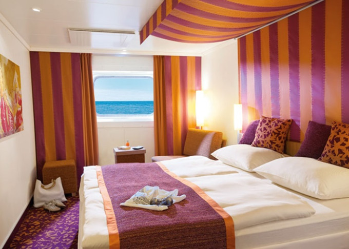 CA - Vonkajšia kajuta PREMIUM / obmedzený výhľad 14-16,5 m². Neotvárateľné okno / obmedzený výhľad. 6. paluba. Max 2 osoby. Cenový model Premium 1 900 € 950 € za osobu